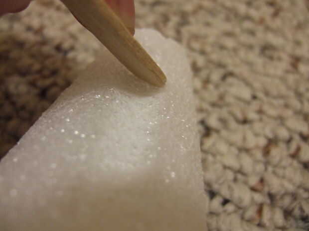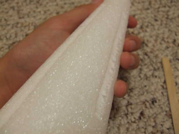 En primer lugar, tomar sus conos y utilizar un palo de paleta o arte para hacer muescas en los lados. Simplemente presionas mientras tira hacia abajo y hacer una línea. Hice cuatro de éstos. Si usted está confundido, vea el cuadro abajo. Ser suave, las roturas de espuma de poliestireno fácilmente. Luego, corte la parte superior del cono de espuma de 1" a 1.5". Repita el proceso en el otro cono.