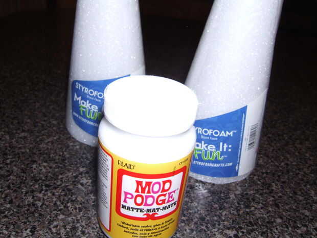 Aquí viene la parte larga. Debe aplicar el Mod Podge en los conos de espuma. Esto es porque la espuma es tan porosa y la pintura de aerosol no se aplica bien. Además, la pintura se funde la espuma. Se necesita muy pocas capas. Seguir aplicando capas hasta que desaparezcan todos los agujeros (usted sabrá, es fácil decir)