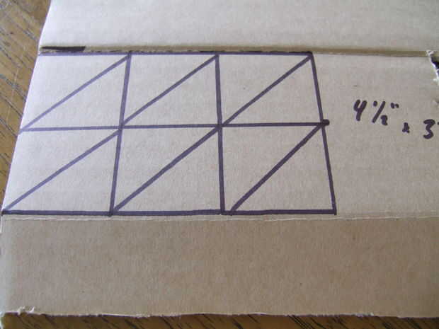 Ahora, tome un pedazo de cartón y hacer un montón de plazas. Sí plazas. Ver la imagen de abajo. Cada cuadrado es 1,5 "x 1,5" entonces dibuja una diagonal a través de él y cortar los chupones. Después de cortar todas las piezas pequeñas, tomar dos triángulos y pegamento o cinta adhesiva. Repita para el resto de los triángulos. Ahora debe tener seis triángulos, cada dos piezas gruesas. Ahora pegar alrededor de la base de la Granada como la imagen de abajo.