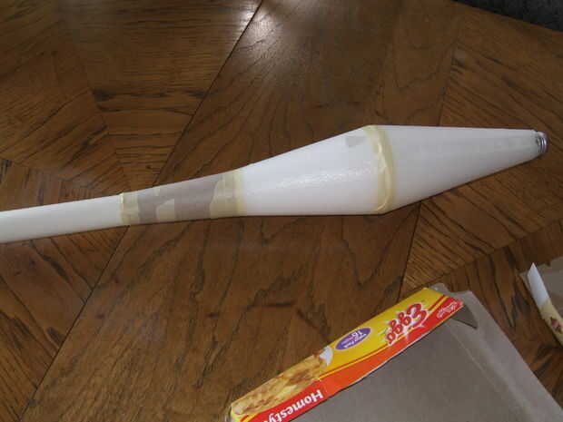A continuación, coloque los dos conos en el tubo de PVC de ø 1". Utiliza una combinación de cinta y pegamento, luego envuelve la cartulina alrededor de él.