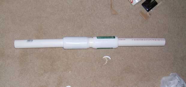 Ahora debe deslizarse dos botellas contacto en el tubo. El extremo más grande (superior) va hacia el acoplador (lo que se une a los tubos de PVC) si bien hecho deben caber ajustados y no requieren encolado.