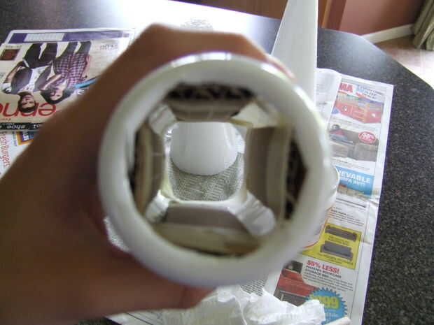 A continuación, había reforzado el interior de la botella con cartulina porque era un poco endeble. Pero también ayuda a mantener la botella en el tubo de RPG.