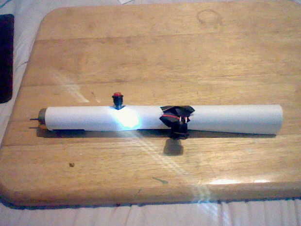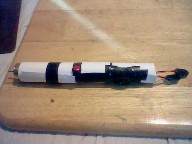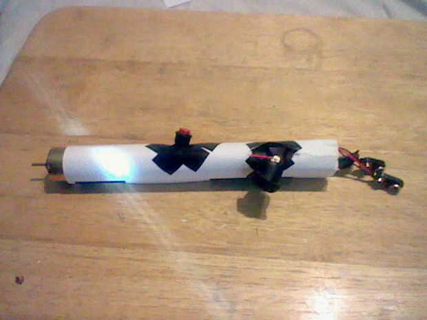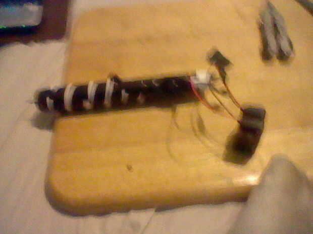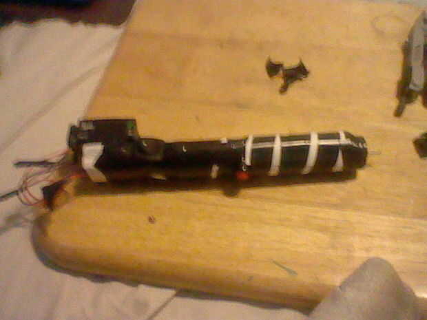 con los tapones de la batería colgando de la parte inferior del cuerpo de cartulina, conecte las baterías y con cinta adhesiva a la parte inferior de la dremel. Si el cuerpo no parece lo suficientemente fuerte como para unir todo, agregar más cartulina y cinta aislante para un cuerpo más grueso, con buen agarre.