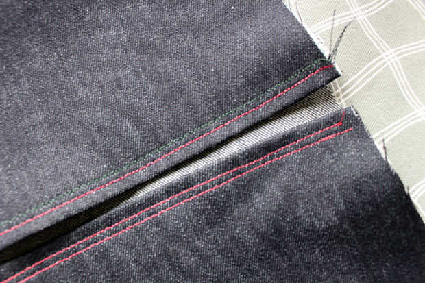 Esta manera, los bordes de las aletas no desenredan. Coser a lo largo de la tapa - hice una doble puntada, y utiliza hilo rojo porque creo que se ve impresionante con el dril de algodón. También es más fácil ver en las fotos :)