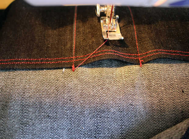 Te recomiendo una puntada más gruesa en la parte superior de las ranuras, porque esto es donde usted quiere asegurarse de que la puntada es robusto y no se romperá. Funcionar la máquina de coser hacia delante y hacia atrás encima de la costura un par de veces, como se muestra en la segunda foto.