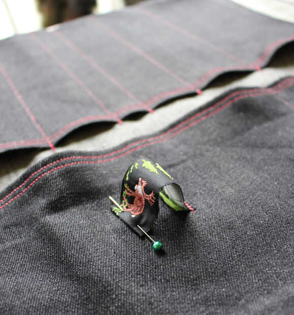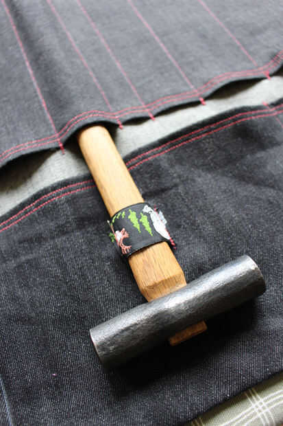 Yo no quería esto para deslizarse hacia fuera, y ya es una de mis herramientas más largo, decidí agregar un lazo para ayudar a mantener en su lugar. Encontré esta fabulosa correa bordada con animales woodsy - corte una tira corta (aprox. 1.5" de largo), plegar los extremos y el perno en su lugar, para que el loop se ajusta muy bien y coser las costuras.