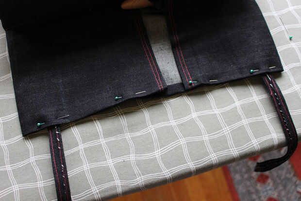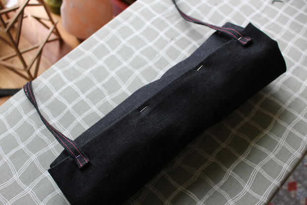 Cubrió una correa el centro y los otros dos de 1" de los extremos de los rollos. Doble sobre el extremo y coser las correas a la vez (demostrada anclada en la segunda foto).