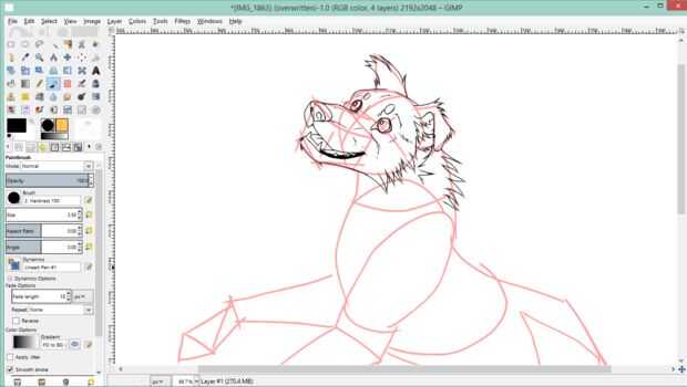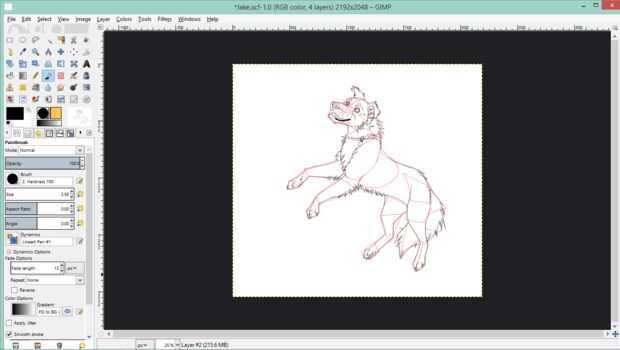 Para esta particular imagen, usé un cepillo duro de 2,5 píxeles, de vez en cuando bajar a 2 píxeles o con un cepillo de 1,5 píxeles para detalles finos. Como dinámica, usé una configuración dinámica de pincel personalizado, que, en la matriz dinámica, tiene los cuadros de tamaño y opacidad comprobar debajo de fade y velocidad.