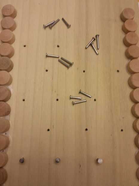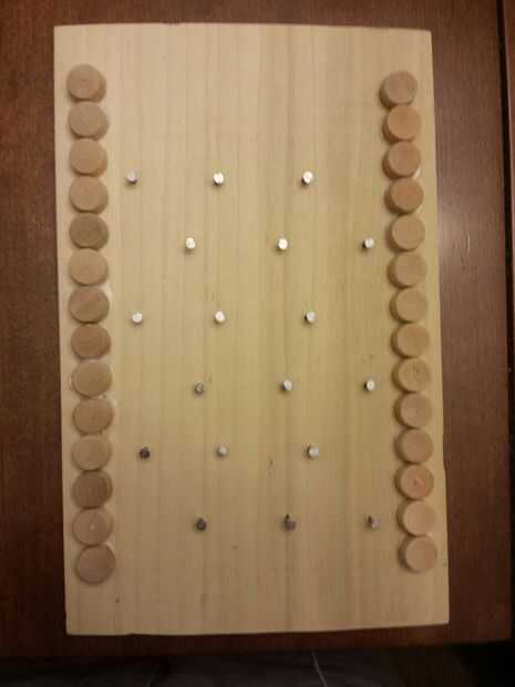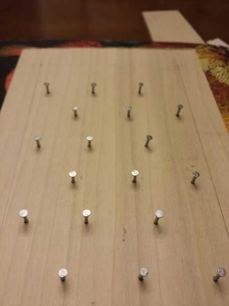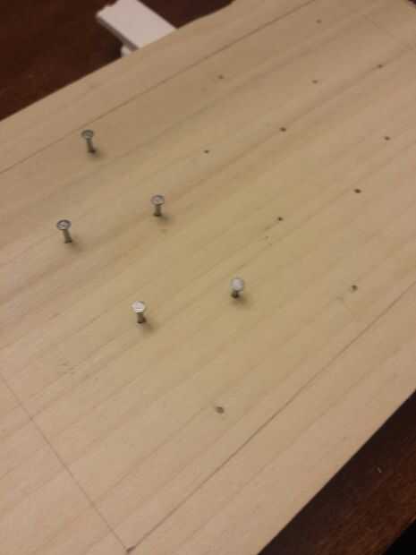 Martille los clavos en los orificios que marcó. [no se olvide poner clavos fuera del rectángulo de 7 x 4 que han marcado]. Una vez que están en, tire de ellas hacia fuera y corte de las puntas así que, cuando está puesto, las uñas no superiores a los enchufes. una vez que se cortan las puntas, martillo los clavos pulg. espalda (usted puede Agregar pegamento si las uñas están demasiado sueltas).