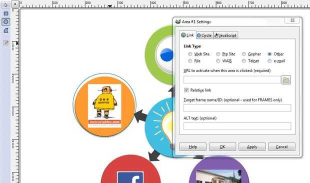 Ahora que estás en la ventana de mapa de imagen, a crear las zonas que se convertirá en tu link clickable. Ya que estamos utilizando un mapa habló con terminaciones circulares, resulta más conveniente utilizar la herramienta circular. Si estás usando una forma irregular debe usar la herramienta polígono, que le permitirá crear muchos diferentes puntos a lo largo de la frontera de su forma (#ProTip: haga doble clic en una vez que han circunnavegado la frontera y dejará de intentar añadir nuevos puntos). Una vez hayas seleccionado la zona que debe ser el enlace de una nueva ventana será emergente donde se entrada tu dirección web. Sugiero copiar y pegar directamente desde la barra de direcciones para evitar cualquier error tipográfico lleva gente a un enlace roto o en el sitio equivocado. Después de que has introducido este haga clic en aplicar y pasar al siguiente link. Al completar cada zona verás que ha añadido en la barra a la derecha de la pantalla.