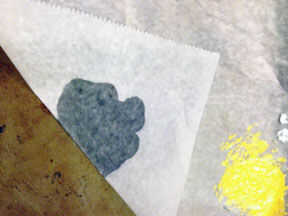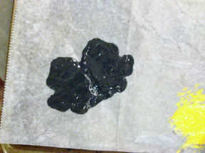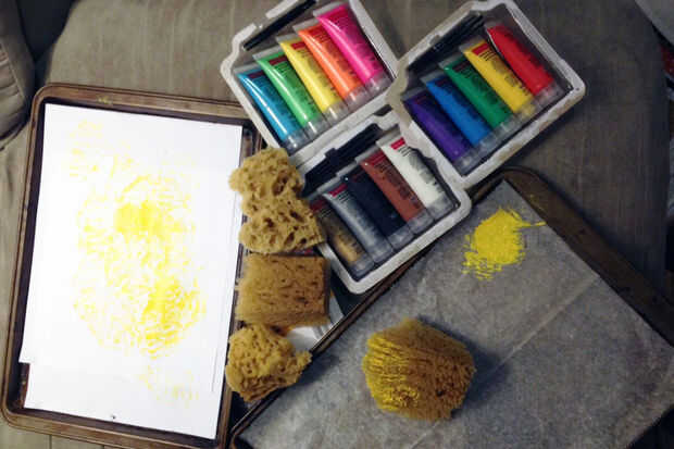 Porque usted está pintando con una esponja, usted necesita menos pintura repartidas en una superficie más grande. Conseguí este por poner una pequeña cantidad de pintura sobre el papel encerado y luego dobla el papel encerado encima y smooshing él. Wahlah; el propio rorschach mini!