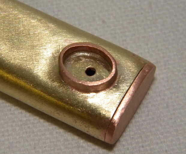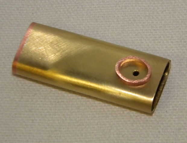 Para encontrar el lugar a taladrar para que la luz del LED para poner la unidad en la parte superior de la vivienda en el lugar que sería dentro de. Raspar una marca en el tubo y la unidad a un lado. Perfore un pequeño agujero y Compruebe la colocación del agujero, poniendo el disco. Saque la unidad. Utilice una tira de cobre para hacer un bisel de la piedra. Soldadura de bisel a la caja. Perfore el bronce más dejando una pequeña cantidad de la piedra para sentarse.