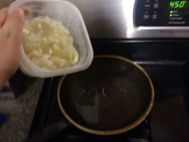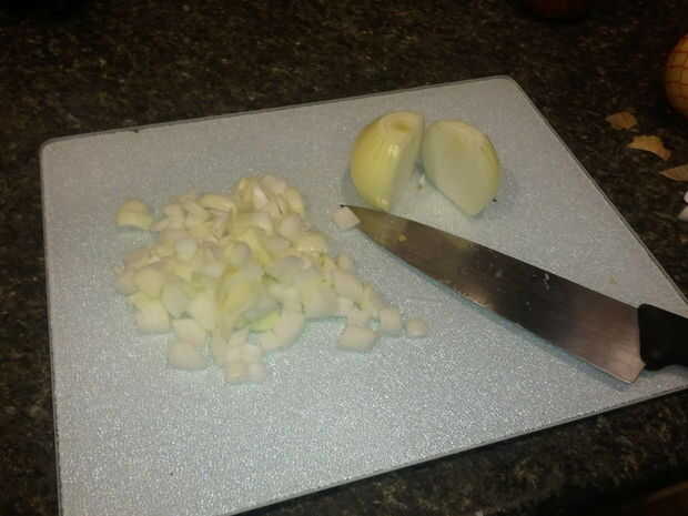 1. picar la cebolla a trocitos como se muestra en la imagen. 2. poner un poco de aceite de oliva en una sartén caliente. 3. Agregue las cebollas picadas y saltear hasta que estén dorados en color. 4. una vez terminado, poner la cebolla en otro recipiente y limpie la sartén.