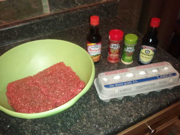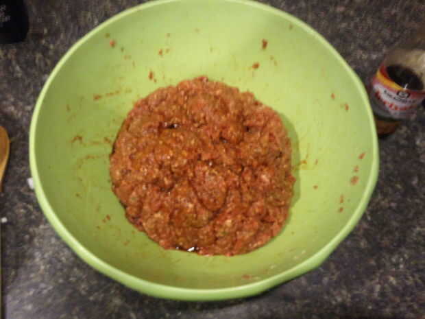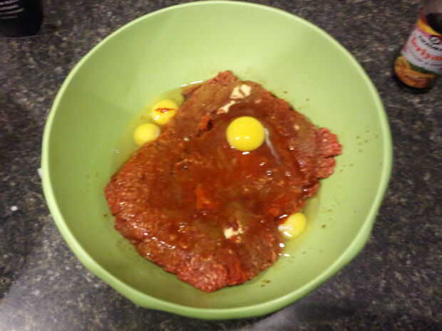 2. usando las manos, mezclar la carne molida con el huevo, salsas y especias. Añadir el pan rallado hasta que la mezcla es apenas capaz de mantener juntos fácilmente.