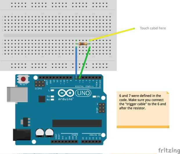 Después de había instalado correctamente la Biblioteca podemos empezar a configurar el código. Para cada sensor capacitivo necesitamos dos pines de Arduino que están puenteados por un resistor de 1M. (Dependiendo de la longitud del cable conectado más adelante puede que necesite cambiar la resistencia.) El cable del punto de contacto está conectado a uno de los pasadores (el pin sensor que definimos en el código) después de la resistencia.