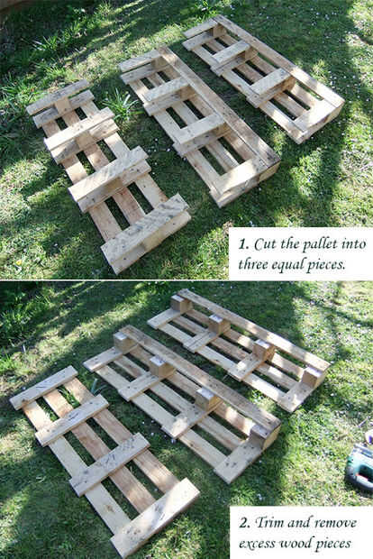 La forma más sencilla de hacer esto es hacer laica la plataforma para que las tablas largas son en paralelo con su propia posición. Si su plataforma tiene nueve tablones, como mina, entonces cuenta tres tablones y luego vio la madera entre los tablones del terceros y cuarto. Vio justo en el medio, para mantener las cosas fácil y para asegurar que todas sus proporciones correctas. Continuar otro tres tablones y corte otra vez. Recuerde que usted tendrá a la sierra en los lugares exactos en el frente y la parte posterior de la plataforma.