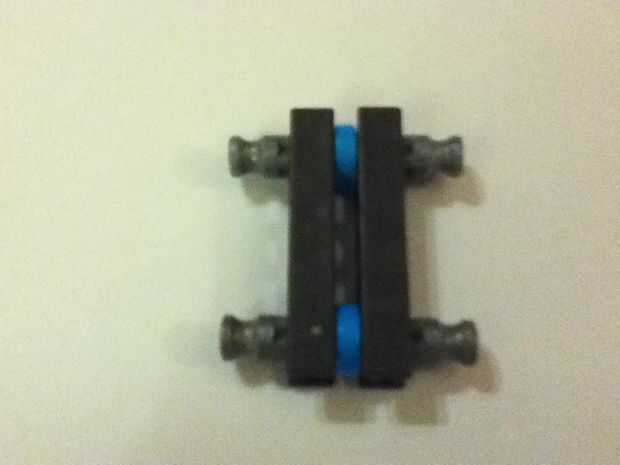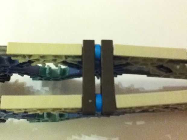 De manera similar al paso anterior, montar los conectores naranja, barras blanco y azul espaciadores demostrados (dos de cada uno) y luego agregarlo a la segunda brecha en el borde superior de la Asamblea de barril. Usted notará que el cañón tiene una forma cónica para su anchura.