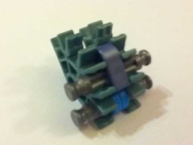 Ahora hacer las dos partes que se muestra. La primera de ellas se hace de dos conectores verdes, dos barras blancas, dos separadores de azul y un pequeño conector azul metálico. Por desgracia no puede sustituir una cerradura tan aquí desde la pequeña clavija conseguiría de la manera. Si no tienes la pieza azul metálica, podría cortar el pasador de una cerradura tan. Preferentemente la cerradura tan tiene una tapa redonda y no cuadrada.