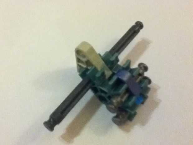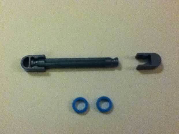 Luego, se reúnen dos distanciadores azul, una barra azul y dos conectores azul metálicos (que puedes hacer tan seguros en su lugar) y utilizarlos para sujetar la parte anterior a la parte posterior de la pistola. La barra azul pasa a través de los conectores rojo en la parte posterior de la pistola y a través de la verde en la parte anterior. Se coloca un espaciador azul en la barra azul en la brecha a cada lado entre los conectores rojo y verdes. Conector gris de luz debe ser hacia la parte superior/parte.