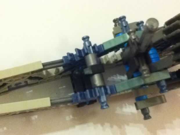Ahora hacer la pieza que se muestra y fije delante del gatillo, debajo de los conectores azules. la pieza negra debe apuntar al frente. Que podría hacer algo más que la pieza del extremo negro de la bola. En última instancia, una banda de goma tiene que ser capaz de envolver sobre él.