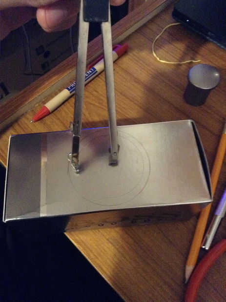 Dibuja otro círculo dentro de la primera de ellas, este es el círculo donde vamos a cortar el agujero para los leds. Mi sugerencia es hacer un desvío de la misma dimensión de la sección "grande" de la base de la botella. Usé una brújula para que sea más fácil.