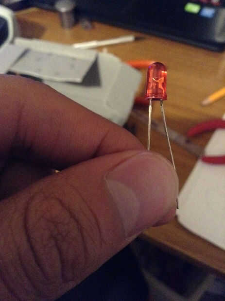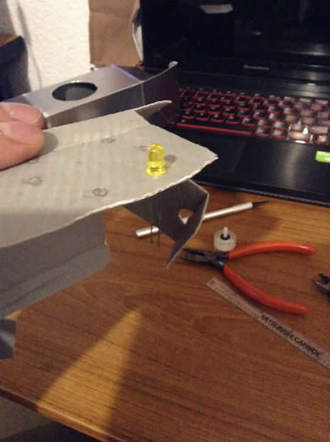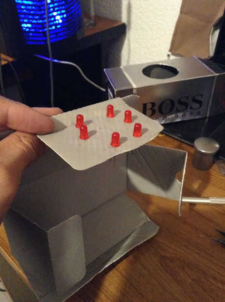 Después de eso, actualmente los leds en su lugar y con una aguja haga el agujero de las clavijas. Luego poner los leds en pero Compruebe la polaridad de los leds. Para comprobar esto, no recomiendo para ver en los pernos. Mejor mirar el led sí mismo. En la foto 4 esta escrita que la "gran bandera" es el pin negativo. PERO sin duda utilizar un multímetro en modo de diodo y comprobarlo. Debe encender pero tuve la experiencia de que los pasadores se invierten. ¿Por qué? NO HAY IDEA. Pero ocurre.
