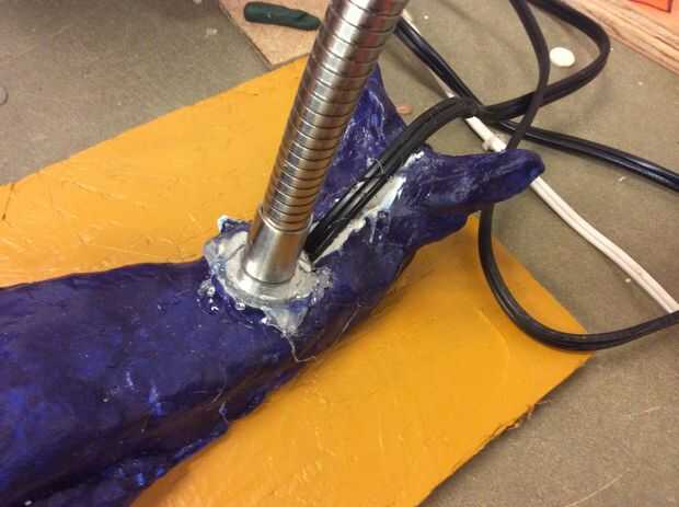 Drilll un agujero en la parte trasera de la ballena donde se inserta la lámpara. El agujero debe ser lo suficientemente profundo a donde puede ver el otro lado de la ballena. Ahora inserte la lámpara y pegamento para apoyo con una pistola de pegamento caliente ya que es más robusto. Ahora espere hasta que el pegamento esté seco y la lámpara tiene algún tipo de estabilidad.