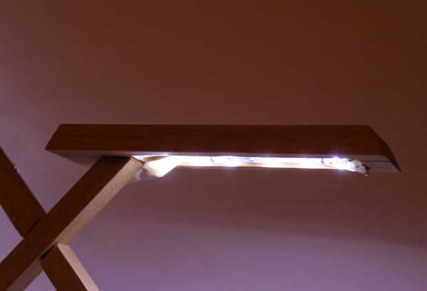 La lámpara sí mismo tomé 3 listones de madera y les pegan. Recomiendo cortar la madera con las dimensiones justas al principio, que cuando el pegamento haya secado todo lo que tienes que hacer es hacerlo suave con la lija. útil para utilizar un tornillo de banco para mantener los listones juntos. Asegúrese de limpiar el pegamento inmediatamente para evitar manchas en la madera.
