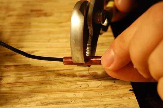 Ahora toma uno de los empalmes de cable y empalme del cable negro del interruptor al cable negro del sostenedor de la lámpara. Tira el plástico cubriendo parte posterior cerca de 3/8" para revelar el cable. Inserte los cables y doblar la media utilizando las pinzas. Si hay una gran cantidad de cableado extra, gire el portalámparas para envolver el cableado adicional en la parte inferior del sostenedor de vela.