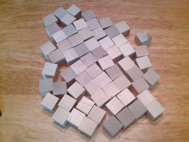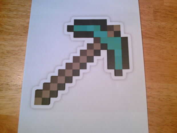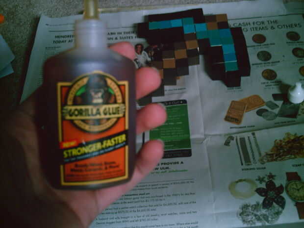 1. alrededor de 70 cubos de madera ¾ pulg. 2. pegamento del gorila 3. acrílicos pinturas 4. un sprite de pico de minecraft impreso de internet 5. en 13 por caja de 13 en sombra 6. 2 cosas de faros de LED 7. mucho tiempo y paciencia