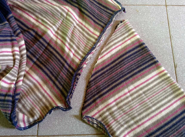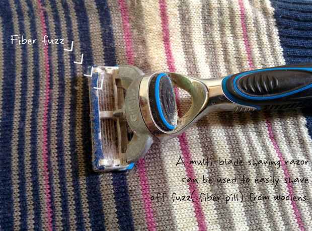 Si tu sweater tiene mucha pelusa o pilling, el producto final no puede ser buena. Sugeriría pelusa de limpieza. Simplemente puede afeitarse de la pelusa con una navaja de afeitar hoja multi uso normal. Como se muestra en la imagen.