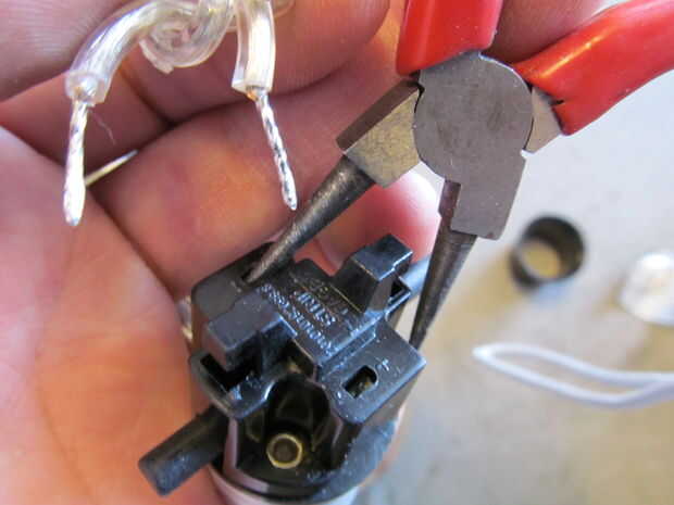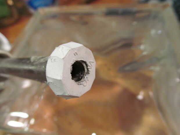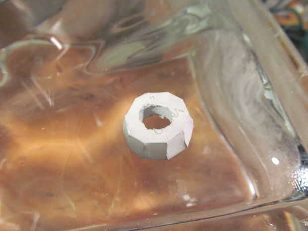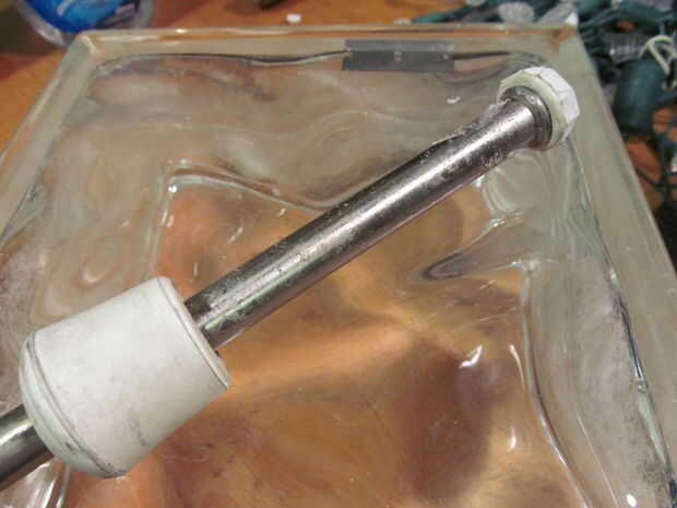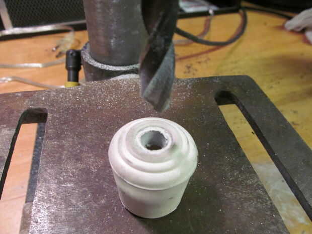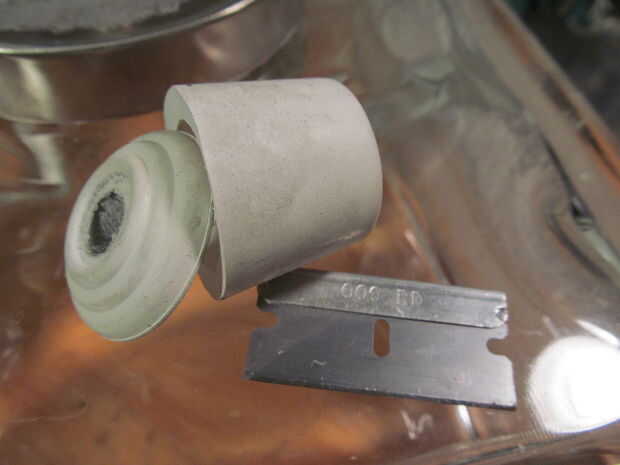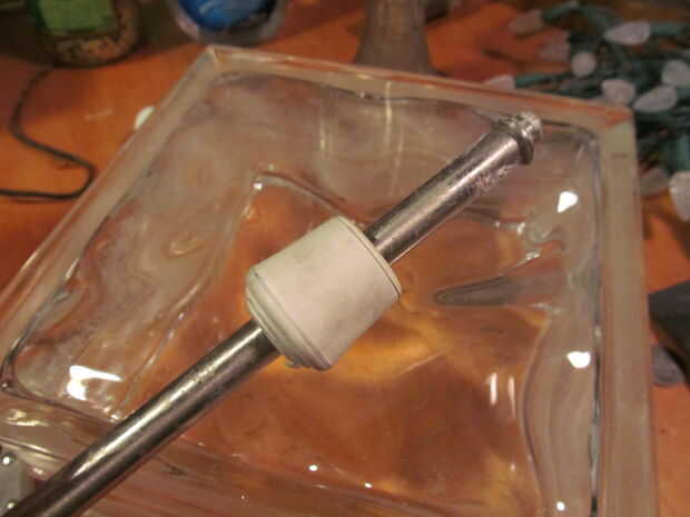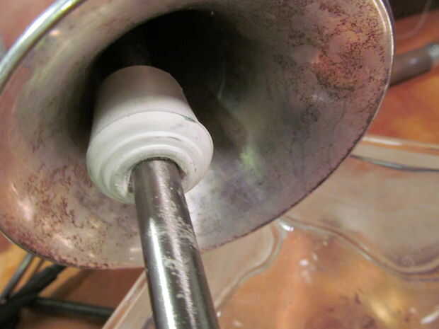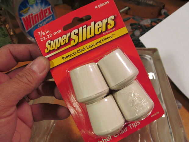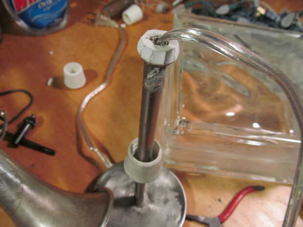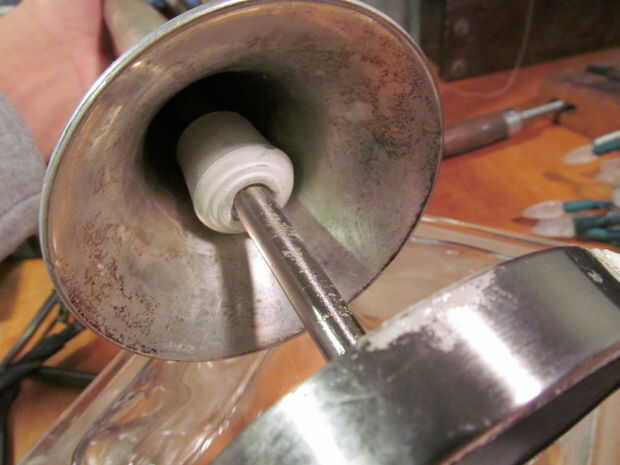 Llevar una pata de silla de goma y perfore un agujero en él. El paquete de cuatro me costó $1. Coloque los pies perforados en el eje de la base. Recortar otro pie y colocarlo en la parte superior del eje por lo que la trompeta tiene dos puntos de contacto a lo largo del eje.