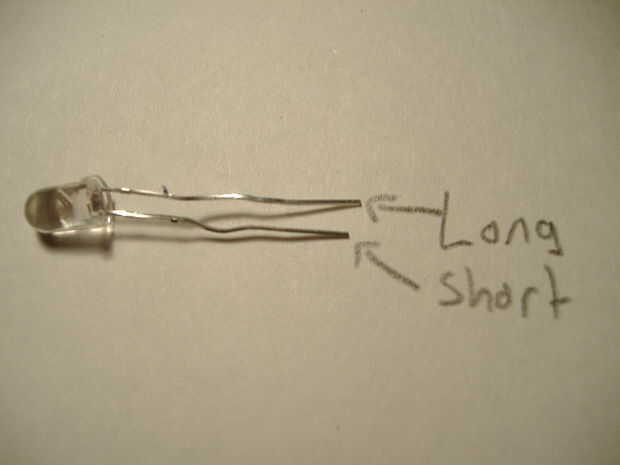 2) ponga sus dos LEDs en sus posiciones con ambos idénticos de tamaño las patas mirando hacia la misma dirección, ya sea derecha o izquierda (esto es para que sepas cuáles cables juntos en el futuro medidas incluso cuando es difícil distinguir sus tamaños después se doblaron).
