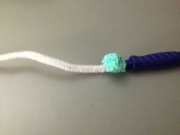 Meter la mayor parte de la esponja con el limpiador de pipa en el lápiz como se muestra.