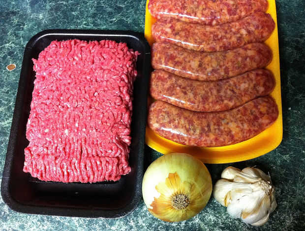 * carne de res magra 3/4 de libra (hamburguesa barato = lasaña grasoso, no lo use)