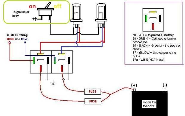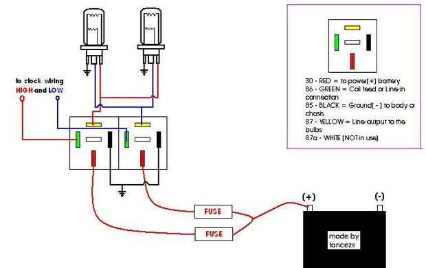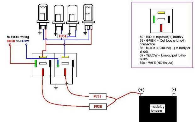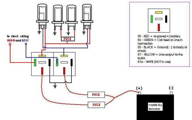antes de retirar el terminal 2 que conecta su viejo cableado de alta y baja a la bombilla. recordar o hacer una etiqueta de lo que es o whre su alto o bajo debe conectarse y no tocar o quitar cualquier otra cosa pero primero poner algunos E.tape en el otro lado de la terminal donde el cableado viejo... basta con el cielo y después quitar la vieja conexión. ahora Conecte su nuevo kit de cables a un lado de su cableado viejo o acciones... Recuerde que su coilfeed(LINE-IN) es con una hembra terminal ahora conectar la terminal al macho hembra entonces E.tape ellos conecten la línea de salida para alta y baja, va a la bombilla y luego lo mismo hacia el otro lado de la linterna... ahora conectarse el cable positivo de la #30 positivo entonces el cable negativo de la batería desde el relé ir al cuerpo/chasis o negativo de la batería y prueba si consigues la conexión correcta...