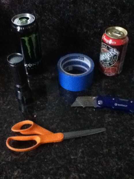 La lista es simple, barato y fácil. 1: soda puede 2: cinta (opcional) (alguna que no está claro y no deja demasiada luz hacia fuera. Utilice esto para cubrir cualquier área de problema). 3: vela ligera linterna o té u otra fuente de luz 4: alfiler o aguja o cualquier otro agujero meter dispositivo (opcional) 5: cuchillo o navaja 6: tijeras 7: pintar 8 (opcional): alambre de suspensión o una forma de la manija (opcional)