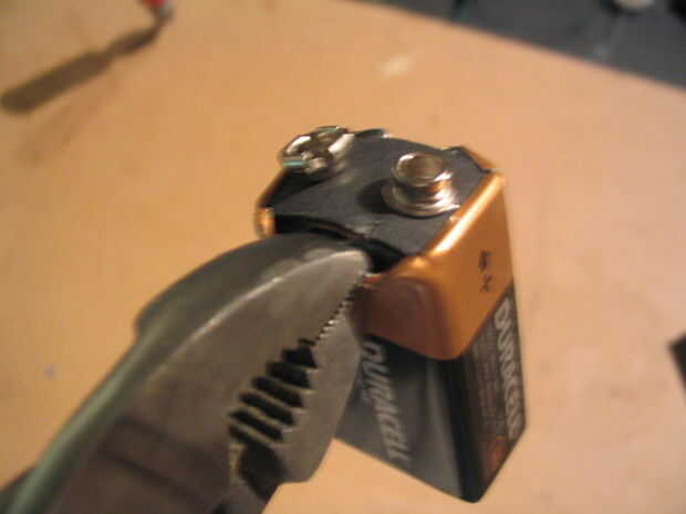 cómo hacer una linterna de una pila de 9V vieja.Materiales:1 pila de 9V vieja1 LED blanco super brillante1 resistencia de 330R1 interruptor pequeñode la soldaduraplastilinaPaso 1: Desarmar la batería El primer paso es desmontar la batería, usando un