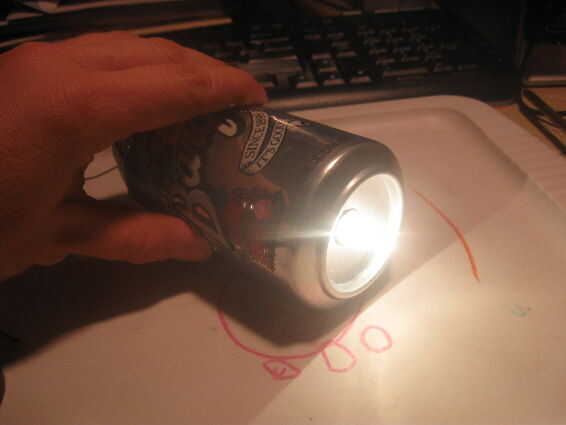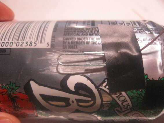11. para hacer un cambio, primero quitar de la pintura de una pequeña sección a medio camino encima de la lata (donde usted esperaría un interruptor que). Esto expone el metal desnudo y hendiduras ligeramente esa zona. Si no haces esto, el circuito no completo ya que la pintura no conducir la electricidad. Luego con cinta adhesiva el clip hacia abajo. Después de hacer esto, usted debería poder poco toque o mueva el clip para "encender" la linterna y apagado.