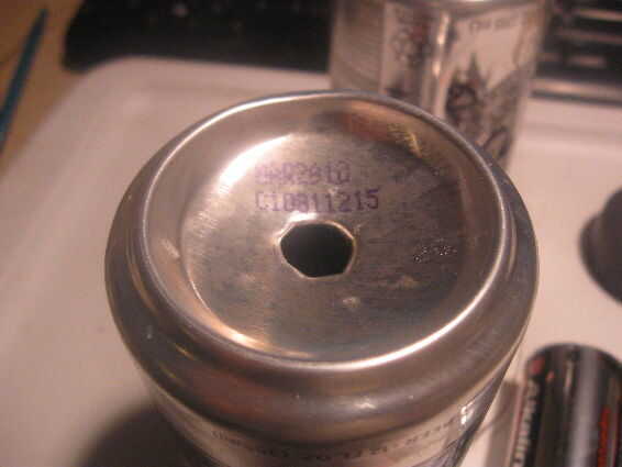 2. hacer un agujero en la parte inferior de la lata con un destornillador y un martillo.  Este es el lado concavo y donde colocar la lámpara.  Tenga en cuenta que la lata es muy buena para una linterna debido a este extremo cóncavo, reflexivo.