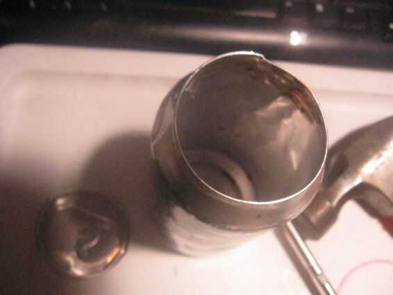 4. quitar la tapa de la lata.  La mejor manera de hacerlo es con un abrelatas como terminará cualquier borde filoso.  Si utiliza un método diferente, bordes afilados de la cinta.  El poder puede ser pegajosa.  Esto sería un buen momento para enjuagarlo.