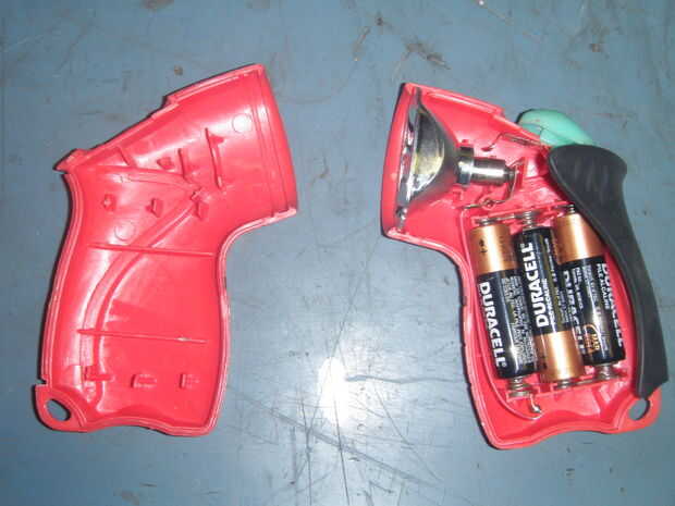 La manilla de goma se pega, pero puesto que esta linterna era unos pocos años, el pegamento era frágil y el mango pelado justo al lado. Después de eso, fue sólo un caso de alzaprimar el ligero se abren.