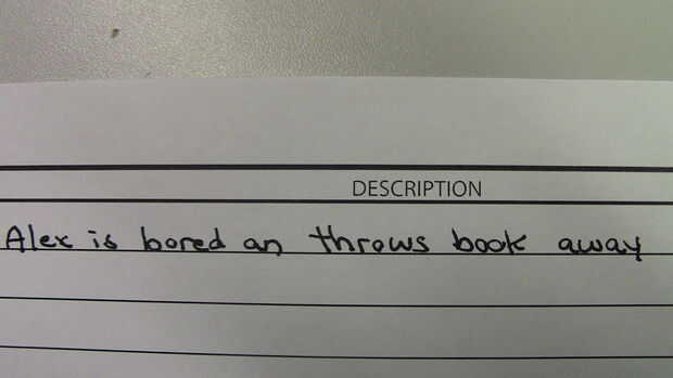 Describir el tiro con un mínimo de palabras un par de lo que está pasando o va a suceder en el tiro. Por ejemplo, "Alex se aburre y lanza lejos el libro".