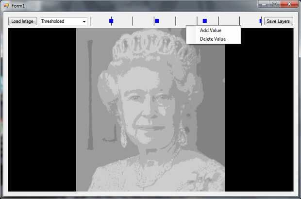 Cuando el programa se está ejecutando, haga clic en el botón 'Imagen de carga' para seleccionar la imagen deseada. Se carga y automáticamente se divide en 2 capas con valores iniciales. El menú desplegable en el medio le permite cambiar entre cada capa, ver la imagen entera thresholded o imagen original en escala de grises.