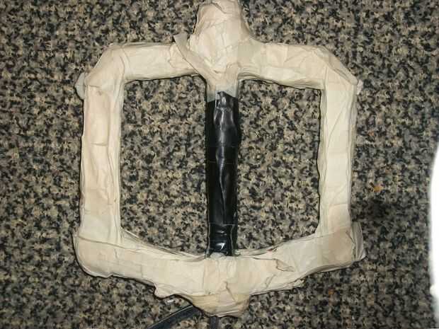 Para la empuñadura, dibujar la forma de la guarnición en la cartulina y recórtalo. Te sugiero cortar 3 para hacerlo más estable. Luego cúbralo con cinta de plata si es de Mickey o cinta adhesiva si está haciendo de Sora. Cinta adhesiva en la parte inferior de la hoja. Una vez tienes el puño, coloque cinta negra en el mango
