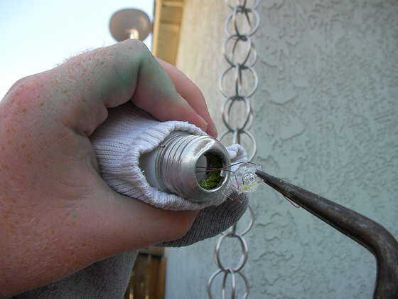 -Utilizar el destornillador como un cincel una vez más y romper el vidrio que contiene el filamento en el interior del bulbo.