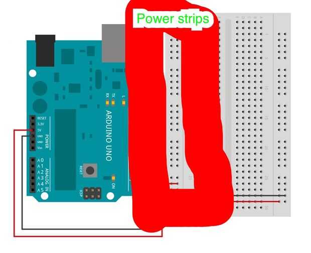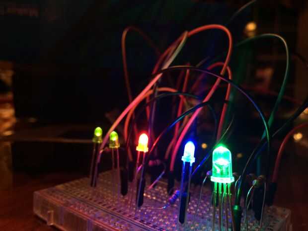 Repita estos pasos para los otros tres LEDs, solo enchufar la clavija de 5V en la regleta. Hacer lo mismo con el cable de tierra en la tira con el signo negativo por él. Hacer el mismo procedimiento, sólo saltar sobre un espacio entre los LEDs.