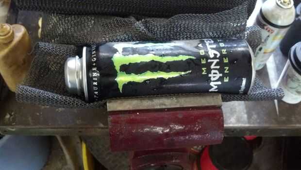 Una vez se ha congelado el agua y una masa sólida de apoyo a los lados y el fondo de la lata, puede comenzar a modificar la lata. Envuelve los dientes metálicos de un tornillo, para evitar daños al bote. Entonces, puse la lata en la prensa que se llevará a cabo firmemente (No lleves la lata). Ahora puede utilizar una dremel para cortar la marca "M" en el lado de la lata. Cortar el agujero para el interruptor (el mío era rectangular).