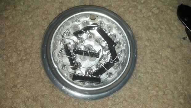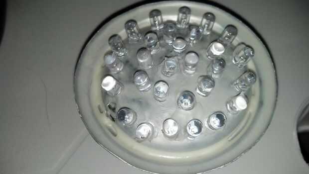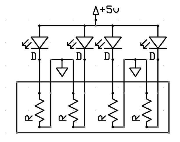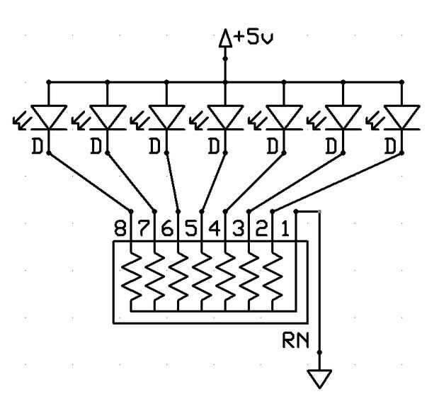 Llene todos los agujeros de 28 en la parte inferior de la lata que perforan para los LEDs con los LEDs. Utilice un poco de pegamento para mantener los LEDs en su lugar. He intentado mantener los ánodos y los cátodos del mismo lado para hacer cables de soldadura más fácil (alambre largo de cable lateral, corto en el otro). Una vez que todos los LEDs en su lugar, puede empezar a doblar los cables en su lugar. Todos los plomos de LED larga curva en filas encima de cada uno de ellos. Esto creará la alimentación positiva. Cada uno los cables cortos va soldados a una resistencia de 100 ohm. Todas las resistencias de 100 ohmios se sueldan juntos en un carril de tierra. Básicamente, este hace una "red de resistencia". Era más barato comprar un bulto de las redes de la resistencia de resistores individuales. Por lo tanto, he utilizado redes de resistencia. Posteriores a la vista; el lote de las redes de resistencia fue aislada resistencia redes (8pin - 4 resistores). Funcionó, pero tuve que usar 7 en vez de 4 y no simplifique la soldadura como quería. Asegúrese de que el ánodo y el cátodo no se cruzan y no toquen la carcasa de aluminio. Esto puede causar un cortocircuito.