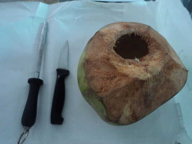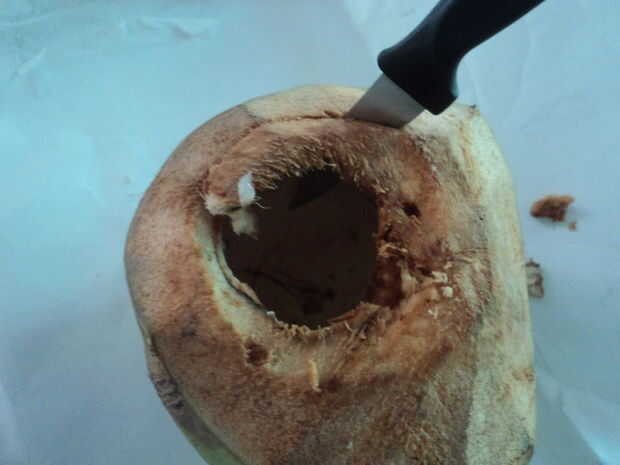 Lo primero que debes hacer es cortar un agujero en la parte superior del coco joven